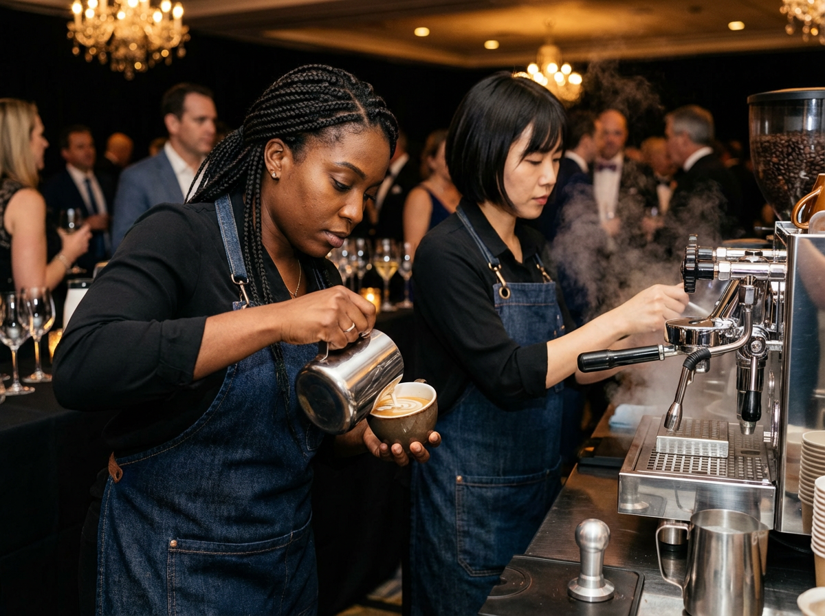 Full espresso bar with professional barista. Lattes, cappuccinos, and specialty drinks. 2 hours included, +$200 per additional hour.